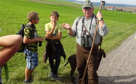 Nicht zu glauben, was es im Wald alles gibt! Man glaubt ja, einiges zu kennen und zu wissen, aber die Waldwanderung mit dem passionierten Jäger und Naturfreund Hans Knauseder belehrte uns eines Besseren. Insgesamt 30 Kinder und Erwachsene wurden von Hans durch den Grindelsberger Wald bei Migelsbach geführt, begleitet von seinem Jagdhund Dina, der bald der Liebling der Kinder wurde.
