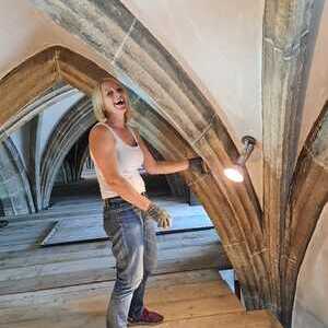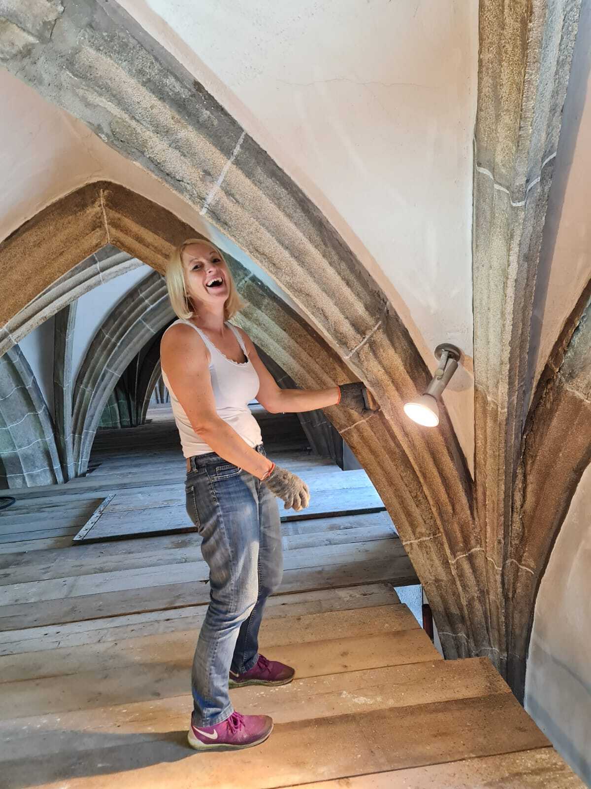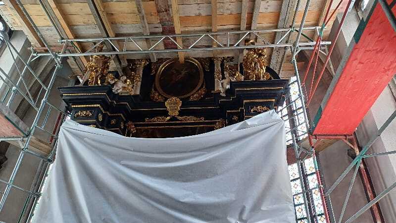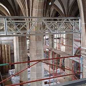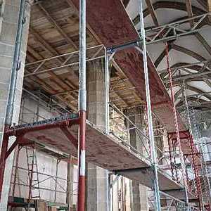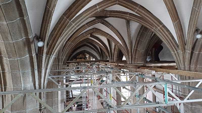 Die Gerüstfirma hat ihre Aufgabe sorgfältig und pünktlich erledigt, sodass jetzt alle zu bearbeitenden Bereiche sehr gut erreichbar sind. Die Steinreinigung ist fast vollständig abgeschlossen. Mittlerweile hat die Maler- und Restauratorfirma mit ihren Arbeiten begonnen, dies ist der Schwerpunkt der nächsten Wochen. Auch die notwendige Verbesserung der Elektroinstallationen, vor allem im Dachboden, ist in nächster Zeit mit der Elektrikerfirma zu bewältigen.