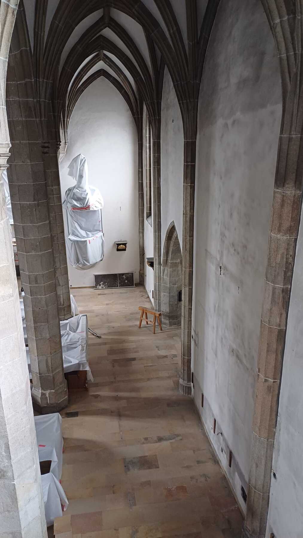 Im Juli wurde der Pfarrsaal als Gottesdienstraum eingerichtet und mit dem Ausräumen in der Pfarrkirche begonnen. Seither haben mehr als 50 verschiedene Helferinnen und Helfer tatkräftig Hand angelegt – beim Ausräumen und Abdecken, bei Demontagen, bei Stemm-, Installations- und Verputzarbeiten, beim Reinigen der Granitelemente (Säulen, Rippen…) und bei manchem mehr. Mittlerweile wurden bereits über 600 freiwillige Stunden erbracht – ganz herzlich Vergelt’s Gott dafür!