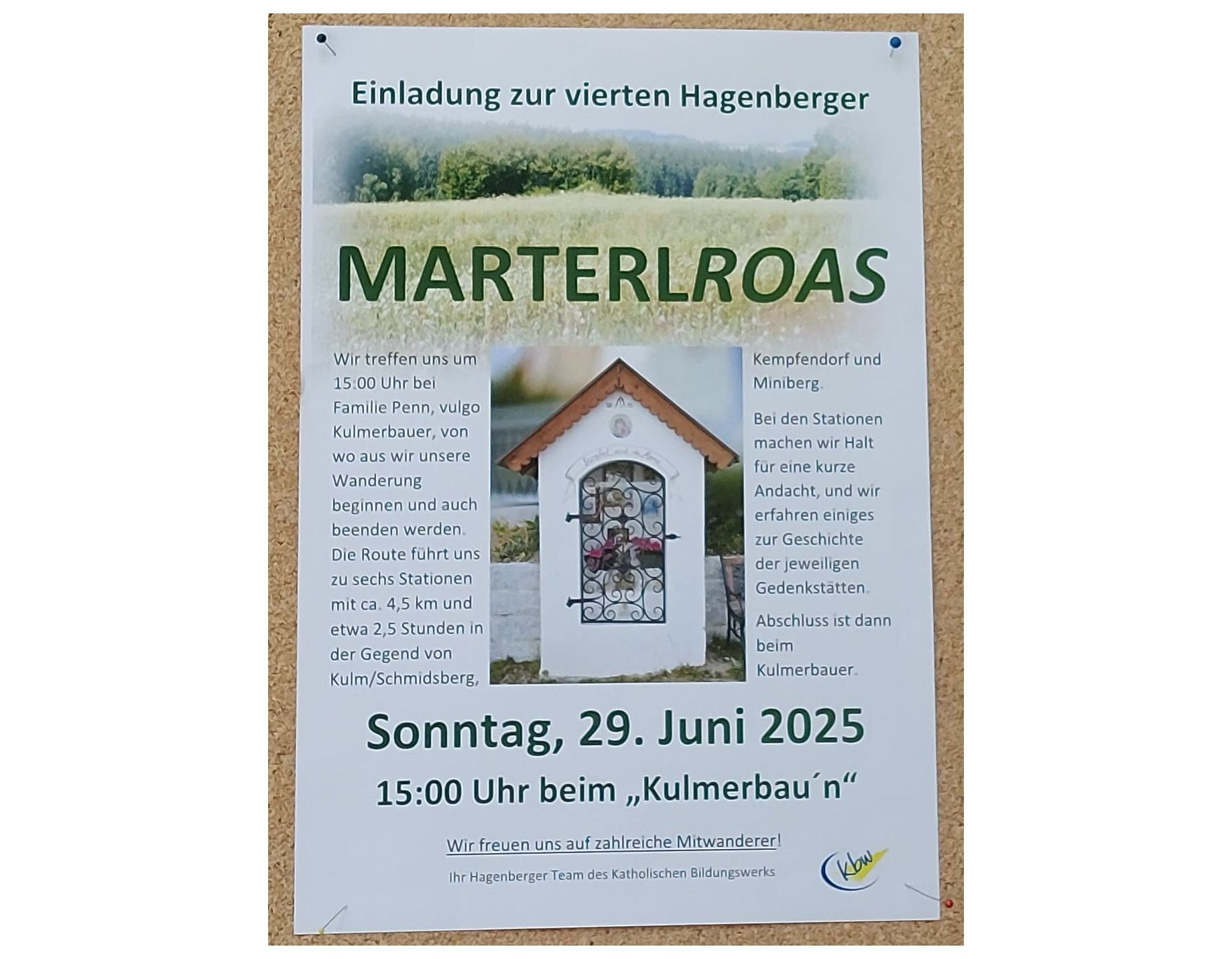 Marterlroas (kbw) Sonntag, 29. Juni 2025, 15:00 Uhr Das kbw lädt herzlich zur 4. Hagenberger-Marterlroas mit Hans Freudenthaler (Geschichtskistl) ein und freut sich auf zahlreiche Mitwanderer! mehr: Marterlroas (kbw)