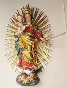 Eine Statue der Muttergottes mit dem Jesuskind aus dem Jahre 1680 ist neben dem linken Seiteneingang aufgestellt. - Unter der Empore und im Chor sind achteckige Apostelbilder des späten 17. Jahrhunderts zu sehen, die zusammen mit den Gemälden Jesu und seiner Mutter Maria vermutlich die Brüstung der Orgelempore zierten, bis diese im 18. Jahrundert erneuert und stuckiert wurde. - An Wänden und Pfeilern reihen sich die 14 Stationen des Kreuzwegs Jesu (von der Veruteilung durch Pilatus bis zur Grablegung), volkstümliche Gemälde des 18. Jahrhunderts.