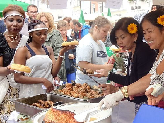 Essen verbindet und bedeutet Gemeinschaft: Rund um den Stadtplatz sorgten Standln mit kulinarischen Köstlichkeiten aus Syrien, Ägypten, von den Philippinen, Thailand, Afghanistan, aus dem Kongo und Österreich für das leibliche Wohl. Mit Genuss und Neugierde wurden die frisch zubereiteten Gerichte verspeist.